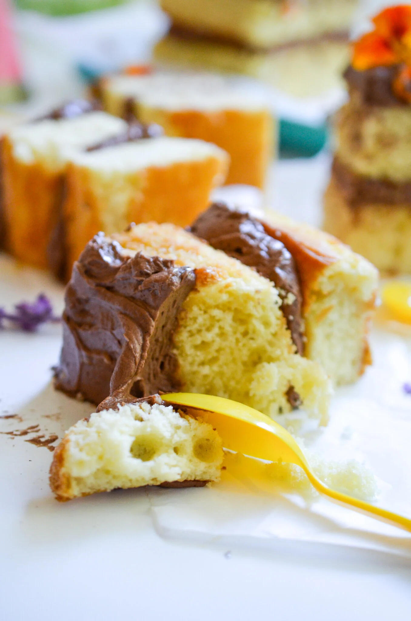 Combine baking powder, cake flour, and salt in a small bowl. Add dry ingredients to butter/sugar mixture. Begin to mix and as you are mixing, slowly pour in the buttermilk. Mix until just combined. Pour into prepared pans. Bake for 25 to 35 minutes depending on which baking pan you used.