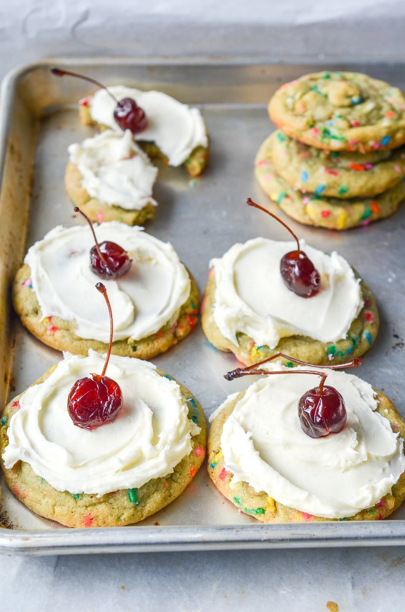 Frost cookies and top with cherry.